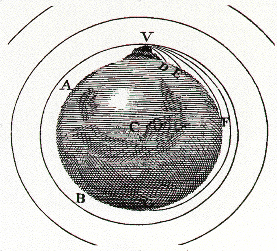 Za početak, korisno je prisetiti se jednog malog pojma Njutonove fizike iz 1687. godine [2]. Na površini Zemlje, ako ispalite projektil horizontalno, on će pasti nazad na Zemlju zbog kombinacije efekata trenja atmosfere Zemlje i gravitacione sile Zemlje. Međutim, pretpostavljajući da Zemlja nema atmosferu koja izaziva trenje, ako ispalite ovaj projektil horizontalno dovoljno brzo, neće se vratiti na Zemlju, već će odleteti u svemir. Ako ste dovoljno visoko da izbegnete razne planine koje mogu biti na putu, postoji, međutim, kritična brzina pri kojoj će projektil biti uhvaćen gravitacijom Zemlje i neće ni pasti na zemlju ni odleteti u svemir (Slika 1).