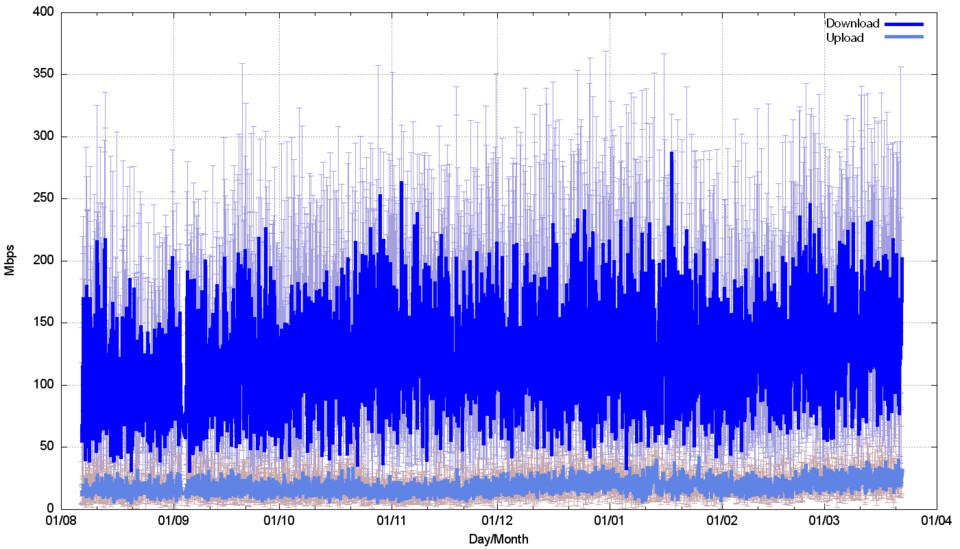 Jedan način da se vidi kako ovi faktori varijabilnosti utiču na karakteristike usluge jeste redovno merenje kapaciteta usluge korišćenjem alata za merenje. Rezultati takvog testa merenja kapaciteta Starlink usluge prikazani su na slici 2. Ovde je test SpeedTest merenja [7], sproveden na četvorosatnoj osnovi u periodu od avgusta 2023. do marta 2024. godine. Usluga pokazuje srednju vrednost protoka od oko 120 Mbps za Download, sa pojedinačnim merenjima od maksimalno 370 Mbps odnosno minimalno 10 Mbps, i protok za Upload od 15 Mbps, sa varijacijama između 5 Mbps do 50 Mbps.