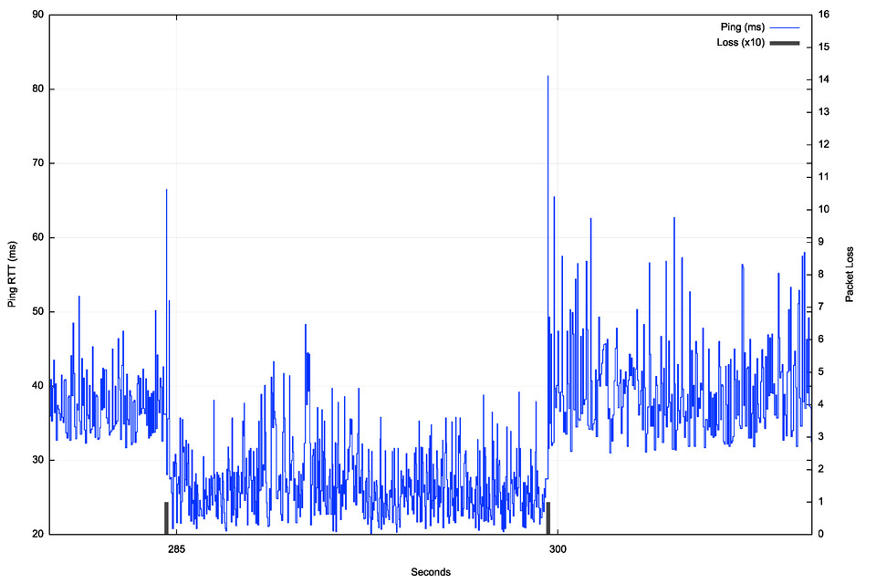 Na kraju, unutar svakog intervala od 15 sekundi tokom kojeg traje praćenje jednog satelita, varijacija latencije je relativno visoka. Prosečna varijacija jitter-a između sukcesivnih RTT (Round-trip time) intervala je 6,7 ms. Pikovi latencije pri prebacivanju nameću dodatnih 30 ms do 50 ms, što ukazuje na prisustvo velikih bafera u sistemu da bi se prevazišli problemi povezani sa promenom satelita. Da bi se ilustrovalo ovo ponašanje veze, skup ping podataka je filtriran da bi se uklonili efekti dodeljivanja satelita u sekundi 283 i sekundi 298. (Slika 5).
