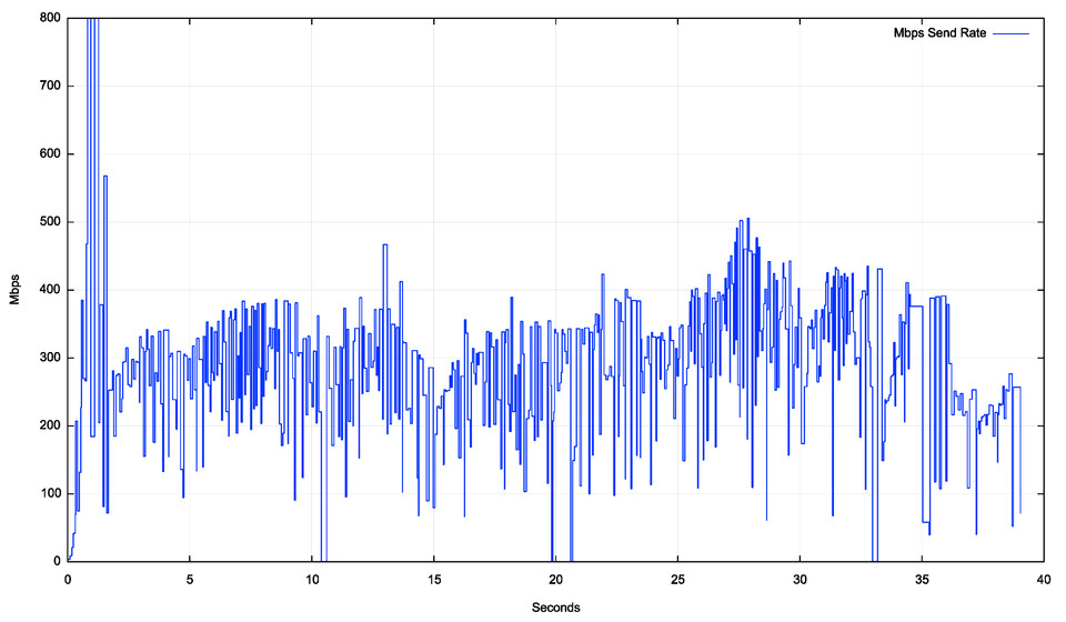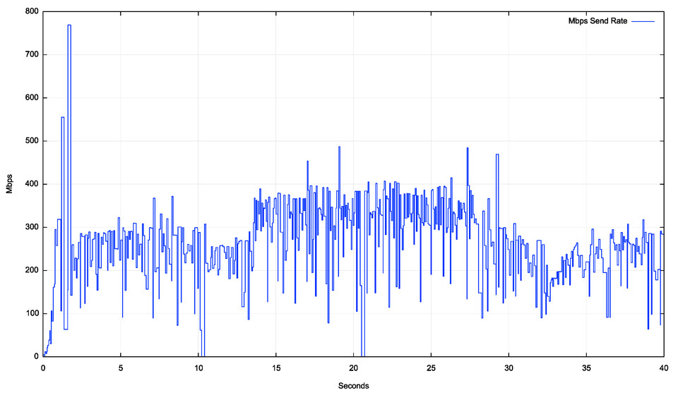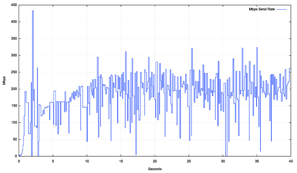 Iz ovog testa, BBR je napravio početnu procenu propusnosti veze od oko 250Mbps. Ova procena je izgleda revidirana nakon 14 sekundi na oko 350Mbps, da bi se zatim smanjila na oko 200Mbps 15 sekundi kasnije, tokom poslednjih 10 sekundi ovog testa. Verovatno je da su ove promene rezultat BBR-ovog odgovora na prebacivanje na drugi satelit od strane Starlinka, gde je varijabilnost kašnjenja bila tumačena od strane BBR-a kao znak formiranja queue-ova, ili odsustva formiranja queue-ova, što je korišćeno za promenu BBR-ove procene propusnosti i kašnjenja za vezu.