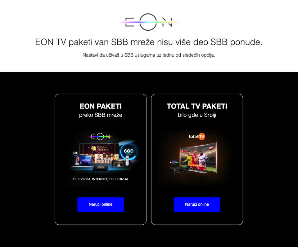 Ta retorika je "pila vodu" neko vreme, ali se onda počeo javljati jedan jako zanimljiv fenomen, koji je opet ugrozio SBB-ovo poslovanje: korisnici su počeli da uzimaju EON van mreže, uz OTT box za 1 dinar bez rente, a onda da uzimaju Internet pretplatu kod Orion telekoma, čiji je vlasnik inače Slobodan Đinović, jedan od ljudi koji je srušio Miloševićev režim, a njegovu firmu je podržala Evropska banka za rekonstrukciju i razvoj (EBRD), čija je nekadašnja direktorka Dragica Pilipović Ćefi sada direktorka u United Grupi.