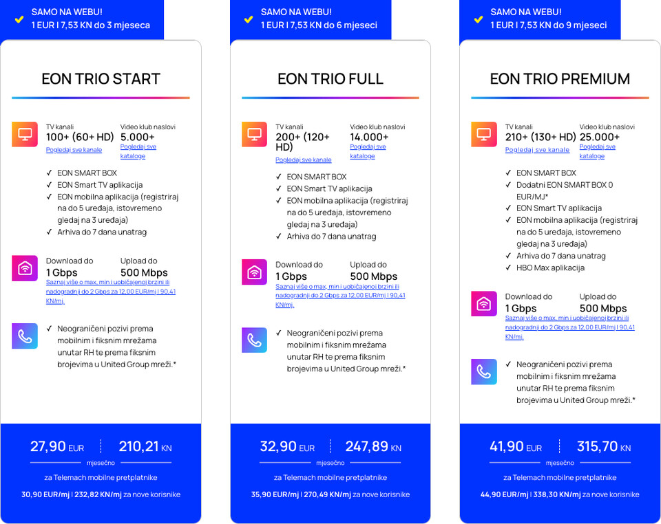 Tako, na primer, najjeftiniji EON paket sa TV+FIX+NET tj. 3 usluge, i brzinom Interneta od 1000/500 Mbps, košta samo 30 EUR mesečno.