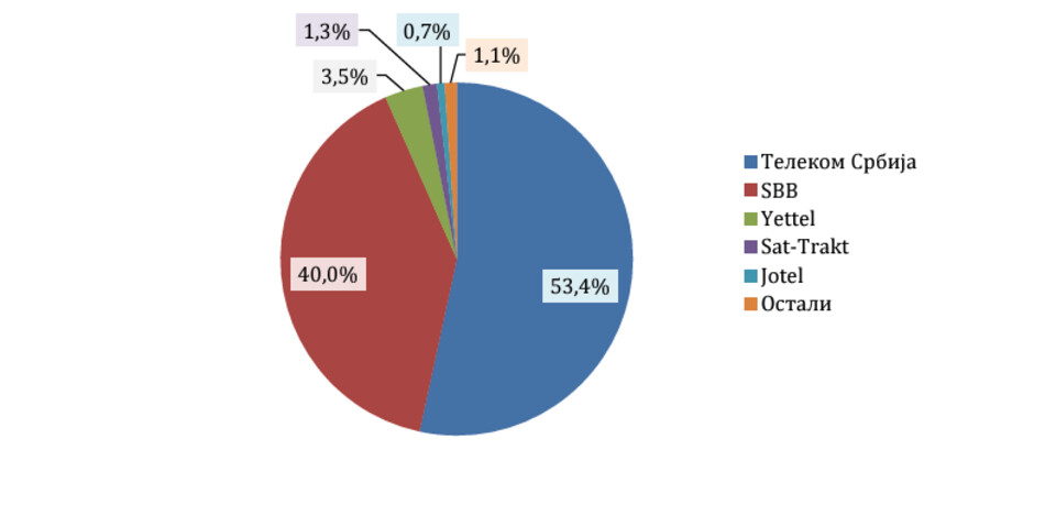 Najveći udeo u broju korisnika ima Telekom Srbija sa 53,4%. Poređenja radi, godinu dana ranije imao je udeo od 52,6%.