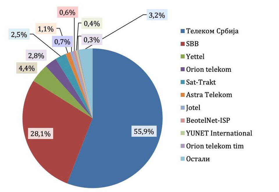 Posmatrajući udeo po operatorima, Telekom Srbija predvodi sa 55,9% tržišta, a nakon toga drugoplasirani SBB sa 28,1% tržišta.
