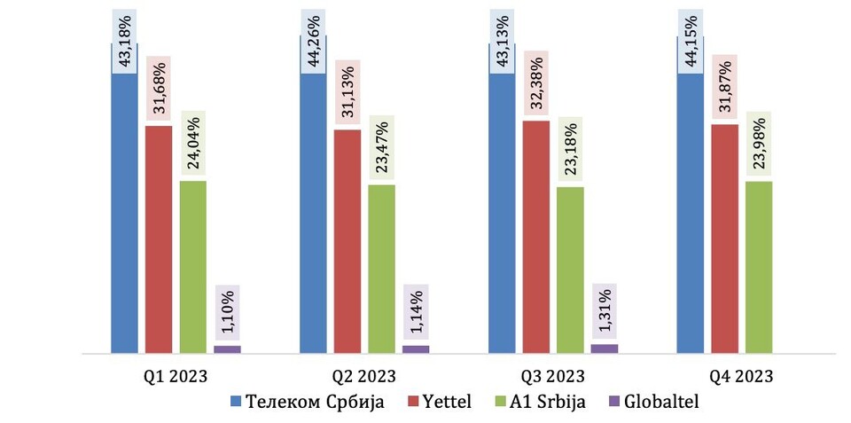 Telekom Srbija i dalje vodi sa najviše korisnika, čak 44,15% udela, za njima sledi Yettel, koji je imao oscilacije u broju korisnika ali se stabilizovao na 31,87% udela, dok A1 Srbija nastavlja svoj blagi pad, i sada ima 23,98% udela korisnika mobilne telefonije.