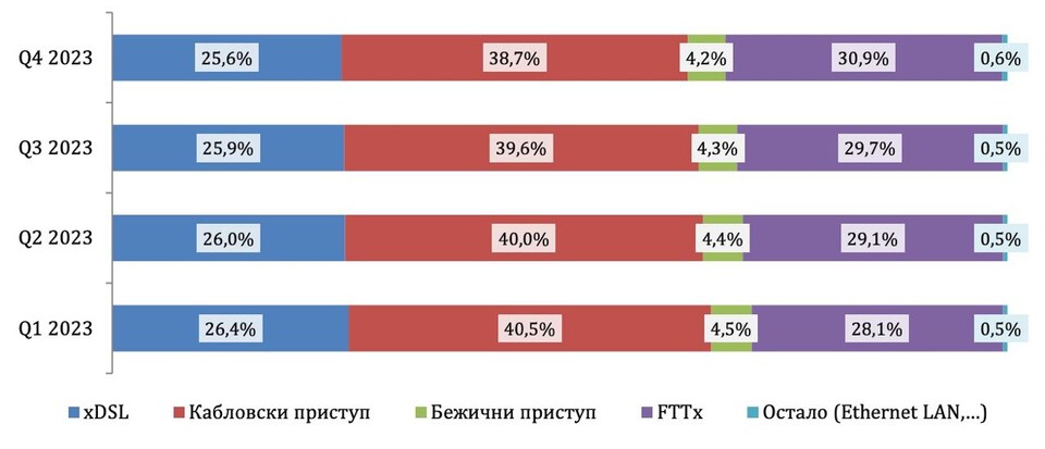 Kada posmatramo udeo prema tehnologiji pristupa, najveći udeo i dalje ima kablovski Internet sa 38,7% - koji je osetno opao u odnosu na početak 2023. godine - zatim optički Internet sa 30,9%, nakon toga DSL sa 25,6% i na kraju fiksni bežični pristup sa 4,2% - koji nastavlja svoj lagani pad već godinama.