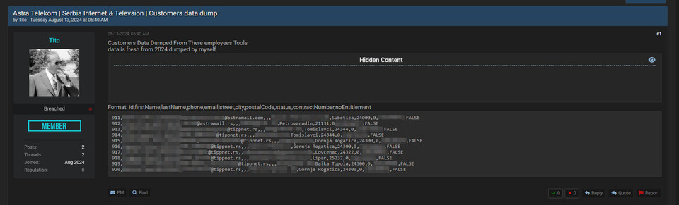 Prema podacima sa foruma Breach Forums, anonimni korisnik pod pseudonimom "Tito" objavio je CSV dump koji navodno predstavlja ispis iz baze podataka Astra telekoma, gde se prema tvrdnjama tog korisnika nalaze lični podaci korisnika, između ostalog ime i prezime, adresa, email adresa, lozinka, i broj telefona. Podatke je pribavio koristeći "alat za zaposlene" i navodi da su to "sveži podaci iz 2024. godine" koje je "lično pribavio".