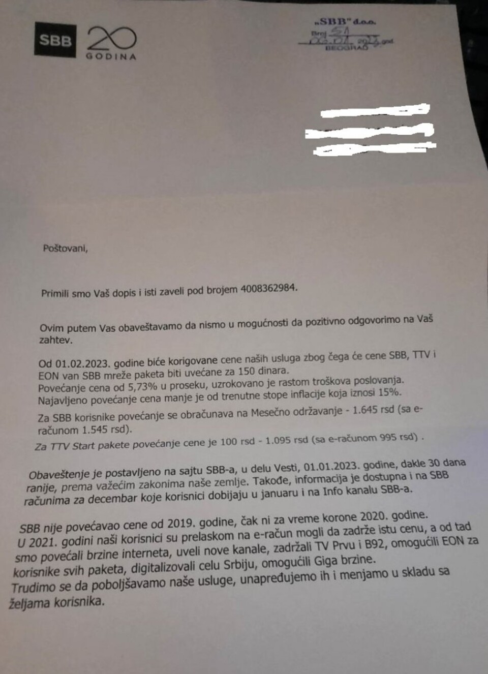 Suprotno zakonskoj regulativi, SBB je odbio korisnikov zahtev za raskid ugovora bez plaćanja nadoknade štete, a kao obrazloženje naveli su da nisu povećali cene od 2019. godine, kao i da su u 2021. godini "povećali brzine interneta, uveli nove kanale, zadržali TV Prvu i B92, […]"