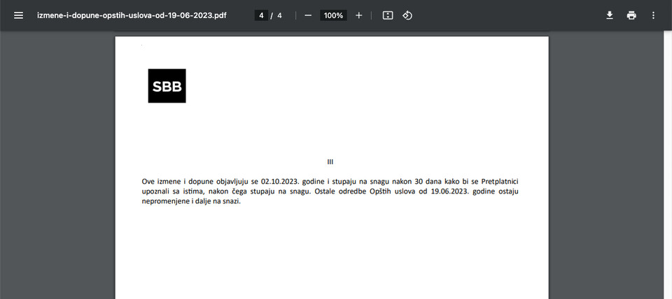 Sada, ponovo imamo situaciju da je SBB objavio dokument "Izmene i dopune opštih uslova od 19.06.2023.", u kojem se na poslednjoj strani nalazi tekst:
