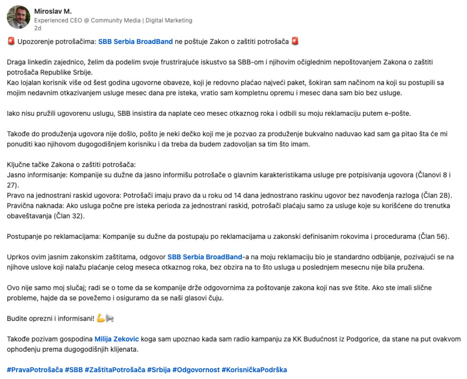 Kako navodi, Miroslav je bio lojalan korisnik SBB-a dugi niz godina i plaćao najskuplji paket, ali se šokirao na način na koji je SBB postupio prema njemu kada je odlučio da raskine ugovor sa SBB-om.